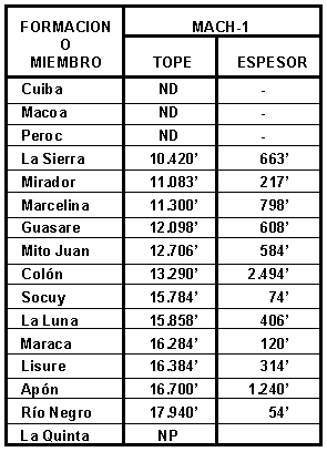 Estratigrafía: Todos los pozos penetraron la Formación La Quinta (Machiques-3 con 124'). La estratigrafía corresponde a la sección tipo del área de Perijá, con todas las formaciones presentes.