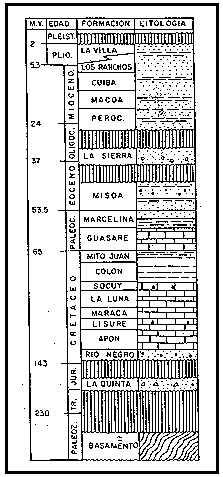 Estratigrafía: Sobre el Basamento se encuentran las calizas y lutitas cretácicas y el Paleoceno de Guasare y Marcelina; discordantemente la Formación La Sierra; y también en discordancia, Peroc, Macoa, Cuiba, Los Ranchos - La Villa.