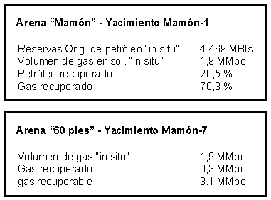 Se encontraron dos intervalos con posibilidades comerciales: la arena "Mamón", petrolífera (31.0-33.4° API), que fue explotada desde el comienzo de las operaciones, y una arena gasífera, denominada "60 pies", que se identificó en el pozo Mamón-7.