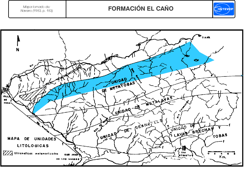 Extensión geográfica: La Formación El Caño aflora como una franja en la parte septentrional de la Serranía del Interior, en los estados Carabobo, Aragua, norte de Guárico y Miranda.