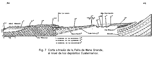 El desnivel vertical en las dos terrazas más antiguas es netamente superior a 35 y a 25 metros, respectivamente. El salto real no se puede evaluar, ya que en el compartimiento hundido, aquellos dos niveles, basculados hacia el Oeste, están sepultados debajo de la terraza C³, más joven (Fig. 7). Esta ha sido igualmente fallada, con un salto vertical de 12 a 18 metros. En tiempos más recientes, se han depositado otras dos terrazas, la última de edad Holoceno, en las cuales no se puede determinar con seguridad la presencia, o la ausencia de fallamiento. De las observaciones anteriores, se deduce que el movimiento ha sido recurrente a lo largo del Cuaternario (puesto que el salto crece con el tiempo), con una velocidad del orden de 0,05 mm/año.