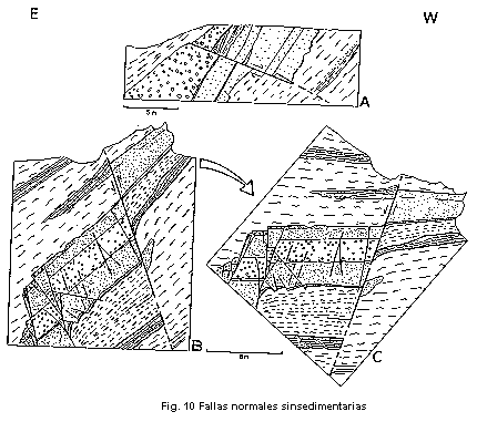 Fallas normales sinsedimentarias en depósitos mio-pliocenos, basculadas posteriormente (Fig. 10).