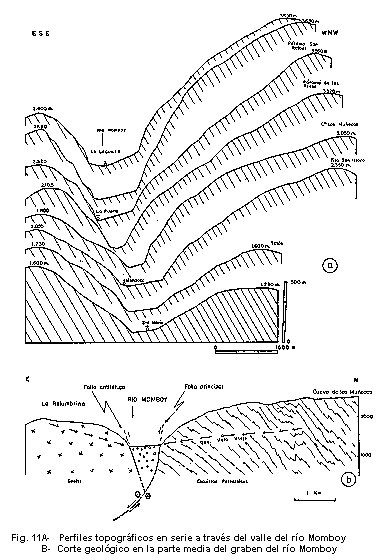 A lo largo del valle del Río Momboy (Fig.4), la presencia de una falla antitética paralela a la principal, pero de buzamiento hacia el NW, provoca la formación de un graben muy estrecho, de 22 km. de longitud. El río Momboy se instaló en esta fosa tectónica, cuyo fondo ha sufrído un constante descenso relativo a lo largo del Cuaternario. Aquel fallamiento antitético podría ser la consecuencia de un cambio de buzamiento en la falla principal, en profundidad (Fig. 11B). Al Sur de este graben, el accidente principal se siguió sobre una distancia de unos 25 kilómetros, principalmente en el paisaje glaciar del páramo Miranda, donde es sumamente dificil evaluar su actividad.