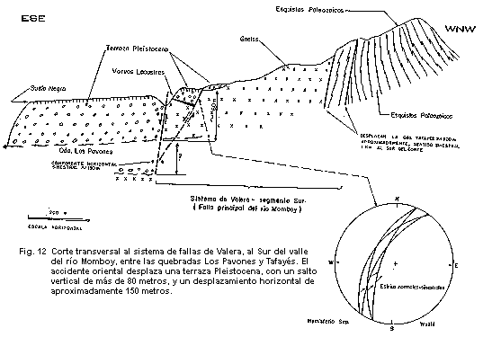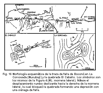 En esta localidad, la morrena lateral izquierda de la quebrada El Caballo ha sido cortada y desplazada 80 m en sentido rumbo-deslizante hacia la derecha (Fig. 16). Detrás del lomo de falla formado por la morrena desplazada (hacia el norte), se ha formado una depresión cerrada y la quebrada ha tenido que desviarse aproximadamente 60 m hacia la derecha. Hacia el noreste, la traza consiste de una trinchera de falla con varias depresiones cerradas y lagunas de falla. Análisis radiocarbónicos del fondo y el tope de la columna sedimentaria en estas lagunas (principalmente turba), sugiere que la edad máxima de las depresiones está entre 3800 y 4500 años A.P., o sea, son rasgos neotectónicos holocenos (SCHUBERT y VALASTRO, 1984).