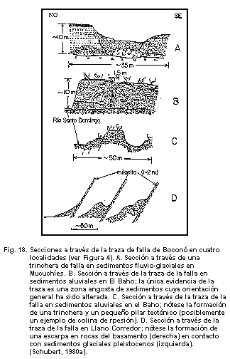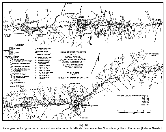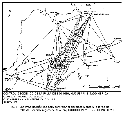 La traza de la falla de Boconó pasa por el borde Sur de la laguna de Mucubají, cortando las morrenas laterales izquierdas del valle de la quebrada Mucubají. Forma una trinchera al sur de la casa de la Universidad de Los Andes, con una pequeña laguna de falla y luego sigue hacia el noreste formando escarpas y trincheras. En la región de Mucubají se han instalado dos sistemas geodésicos (Figura 17) para controlar el desplazamiento a lo largo de la falla de Boconó (SCHUBERT y HENNEBERG, 1975): A. un sistema primario con 8 estaciones ancladas en roca, con distancias entre estaciones de varios kilómetros; y B. un sistema secundario, alrededor de la laguna de Mucubají, de 8 estaciones ancladas en sedimentos glaciales, con distancias entre estaciones de hasta 1 km. Mediciones geodésicas entre 1975 y 1981 (HENNEBERG, 1983) han demostrado un desplazamiento compresional de los dos lados de la falla, con una componente lateral (paralela a la falla) de 13 m en 66 meses, o sea, un desplazamiento de 0,24 cm/año.