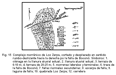 En esta localidad, la traza de la falla de Boconó corta las morrenas laterales del valle de la Quebrada Los Zerpa, separándolas de la morrena ferminal (Fig. 15), la cual ha sido desplazada aproximadamente 70 m en sentido rumbo deslizante hacia la derecha (SCHUBERT y SIFONTES 1970). La Quebrada Los Zerpa drenaba originalmente a través de la morrena terminal, pero actualmente fluye a lo largo de la traza de la falla saliendo por El Fraile hacia el río Santo Domingo. En el valle de la Quebrada Los Zerpa se observan dos niveles de terrazas fluvio-glaciales (SCHUBERT, 1981): 6-10 m y 20-25 m. La terraza de 20-25 m consiste de conglomerados fluvio-glaciales productos de la deglaciación inicial post-Pleistocena; la terraza de 6-10 m consiste de tres facies, de norte a sur: a) una facies lacustre, formada por arcillas laminadas en la parte inferior del valle morrénico; b) una facies deltaica en la parte central; y c) una facies fluvio-glacial hacia la parte superior del valle. Esto se interpreta de la siguiente manera: durante la fase inicial de la deglaciación, el valle morrénico se rellenó con sedimentos fluvio-glaciales derivados de la fusión del glaciar. Luego se formó una brecha en la parte terminal de la morrena, posiblemente debido a desplazamiento a lo largo de la falla, cambió el gradiente de la quebrada y ésta corto y erosionó estos sedimentos fluvio-glaciales (terraza de 20-25 m). Luego se cerró nuevamente el valle y se formó una laguna en la parte inferior y se depositaron sedimentos fluvio-glaciales más arriba, en forma de un delta. Nuevamente se abrió una brecha en la morrena terminal y la quebrada y la laguna, los cuales drenaban por encima de la morrena terminal, cortaron otro nivel de terraza (6-10 m) y drenó a través de la traza de la falla de Boconó. Hacia el sureste, en El Fraile se observa una escarpa de falla bien definida y una laguna de falla, modificada posteriormente por el hombre. Más hacia el sureste, se divisa el complejo morrénico de El Venado, cortado y desplazado también por la falla de Boconó (GIEGENGACK y GRAUCH, 1976).