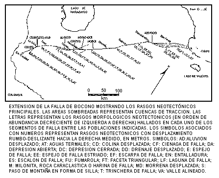La zona de falla de Boconó, uno de los rasgos geotectónicos mas importantes de la parte noroccidental de América del Sur (Fig. 2), se caracteriza morfológicamente por una alineación de valles y depresiones lineales (cuencas de tracción), orientados aproximadamente en dirección N45°E. Se extiende por más de 500 km entre la depresión del Táchira (al sur de Cordero) y el Mar Caribe (área de Morón, Edo.Carabobo), cruzando en forma oblícua a los Andes merideños y cortando el extremo occidental de las Montañas del Caribe (Cordillera de la Costa y Serranía del Interior). A lo largo de toda su extensión, se observan una o varias trazas activas, denominadas falla de Boconó, la cual se caracteriza por escarpas de falla, canales fluviales desplazados, la gunas de falla, lomos de falla y otros rasgos geomorfológicos típicos de fallas rumbo-deslizantes. El desplazamiento actual y pasado a lo largo de esta zona de falla ha sido motivo de gran controversia.
