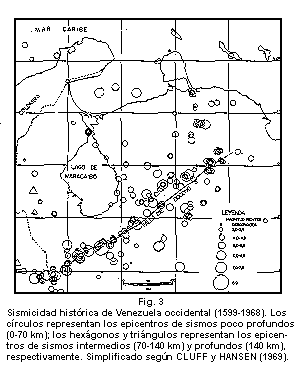La actividad sísmica de los Andes merideños fue analizada por FIEDLER (1970, 1972), quien sugirió que esta actividad puede subdividirse en dos períodos: antes y después del sismo de 1812. La frecuencia de sismos parece haber aumentado después de ese evento, pero la energía liberada no cambió. Raúl ESTEVEZ, en una conferencia presentada en la XXX Convención Anual de AsoVAC en Mérida, demostró que el número de sismos con magnitud mayor a 5, entre 1610 y 1945, era significativamente mayor en los extremos noreste y suroeste de la falla de Boconó (sugiriendo una mayor actividad en los extremos, posiblemente debido al amortiguamiento del desplazamiento) y que la profundidad focal hacia los extremos era de aproximadamente 30 km y en la parte central de la falla, de aproximadamente 15 km. La sismicidad de la falla de Boconó fue estudiada en detalle por DEWEY (1972) quien, con base en el análisis de "movimientos iniciales" (first motion), demostró que el desplazamiento a lo largo de ella es consistente con un desplazamiento hacia el este de la placa del Caribe, con respecto a América del Sur, así como también de que el contacto entre ambas placas está localizado parcialmente a lo largo de la falla de Boconó (MOLNAR y SYKES, 1969; SCHUBERT, 1970, SCHUBERT y SIFONTES, 1970). De acuerdo con DEWEY (1972), este contacto incluye a la falla de Boconó desde el Plioceno (aproximadamente hace 5 millones de años). La orientación transversal de la falla de Boconó con respecto a la cordillera, así como el hecho de que corta provincial geológicas y tectónicas distintas, es indicio de que esta falla es una estructura externa a los Andes y de que ella se incorporó al límite en el Terciario Tardío. La Fig. 3 muestra la sismicidad histórica de la falla de Boconó, según una compilación de CLUFF y HANSEN (1969).