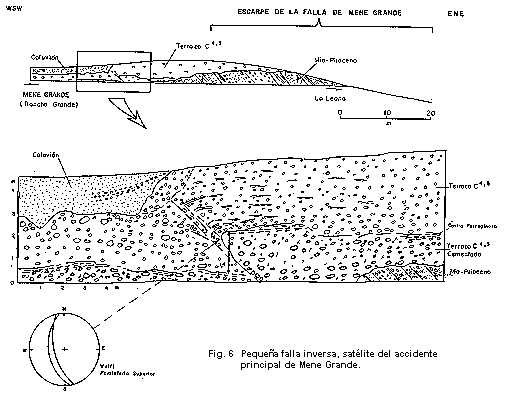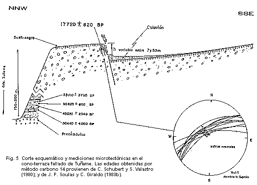 Se trata de una falla en "échelon", de desplazamiento esencialmente normal (bloque Oeste levantado), con una muy pequeña componente dextral. Su velocidad se puede estimar entre 0,5 y 1 mm/año, en la misma terraza fallada de Tuñame. La edad de ésta, determinada por método carbono 14, es de 50.640 a 33.710 años en sus niveles de base (C. SCHUBERT y S. VALASTRO, 1980), y de 17.720 en su tope (J. P. SOULAS y C. GIRALDO, 1983b). La Figura 5 sintetiza las observaciones efectuadas en el cono-terraza de Tuñame.