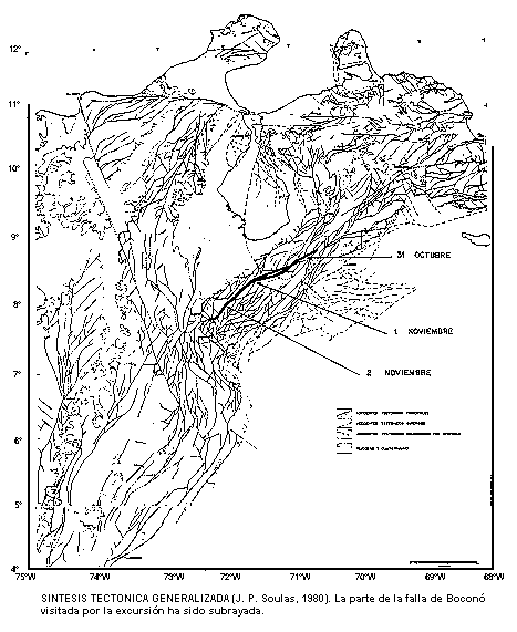 Esta excursión tiene como propósito, presentar a los participantes las características neotectónicas específicas de la falla de Boconó en el tramo comprendido entre Santo Domingo (Estado Mérida) y San Cristóbal (Estado Táchira) (Fig. síntesis tectónica generalizada).