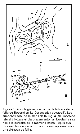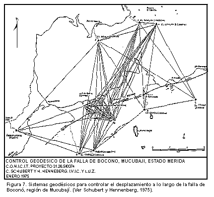 La traza de la falla de Boconó pasa por el borde sur de la laguna de Mucubají, cortando las morrenas laterales izquierdas del valle de la Quebrada de Mucubají. Forma una trinchera al sur de la casa de la Universidad de los Andes, con una pequeña laguna de falla y luego sigue hacia el noreste formando escarpas y trincheras. En la región de Mucubají se han instalado dos sistemas geodésicos (Fig. 7) para controlar el desplazamiento a lo largo de la falla de Boconó (Schubert y Henneberg, 1975): a. un sistema primario con 8 estaciones ancladas en roca, con distancias entre estaciones de varios kilómetros; y b. un sistema secundario, alrededor de la laguna de Mucubají, de 8 estaciones ancladas en sedimentos glaciales, con distancias entre estaciones de hasta 1 km. Mediciones geodésicas entre 1975 y 1981 (Henneberg, 1982) han demostrado un desplazamiento compresional de los dos lados de la falla, con una componente lateral (paralela a la falla) de 13 mm en 66 meses, o sea, un desplazamiento de 0,24 cm/año.