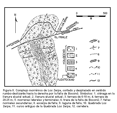En esta localidad, la traza de la falla de Boconó corta las morrenas laterales del valle de la Quebrada Los Zerpa, separándolas de la morrena terminal (Fig. 8), la cual ha sido desplazada aproximadamente 70 m en sentido rumbo-deslizante hacia la derecha (Schubert y Sifontes, 1970). La Quebrada Los Zerpa drenaba originalmente a través de la morrena terminal, pero actualmente fluye a lo largo de la traza de la falla saliendo por El Fraile hacia el río Santo Domingo. En el valle de la Quebrada Los Zerpa se observan dos niveles de terrazas fluvio-glaciales (Schubert, 1981): 6-10 m y 20-25 m. La terraza de 20-25 m consiste de conglomerados fluvio-glaciales productos de la glaciación inicial post-Pleistocena; la terraza de 6-10 m consiste de tres facies, de noprte a sur: a) una facies lacustre, formada por arcillas laminadaas en la parte inferior del valle morrénico; b) una facies deltáica en la parte central; y c) una facies fluvio-glacial hacia la parte superior del valle. Esto se interpreta de la siguiente manera: durante la fase inicial de la deglaciación, el valle morrénico se rellenó con sedimentos fluvio-glaciales derivados de la fusión del glaciar. Luego se formó una brecha en la parte terminal de la morrena, posiblemente debido a desplazamiento a lo largo de la falla, cambió el gradiente de la quebrada y ésta cortó y erosionó estos sedimentos fluvio-glaciares (terraza de 20-25 m). Luego se cerró nuevamente el valle y se formó una laguna en la parte inferior y se depositaron sedimentos fluvio-glaciales más arriba, en forma de un delta. Nuevamente se abrió una brecha en la morrena terminal y la quebrada y la laguna, los cuales drenaban por encima de la morrena terminal, cortaron otro nivel de terraza (6-10m) y drenó a través de la traza de la falla de Boconó. Hacia el sureste, en El Fraile, se observa una escarpa de falla bien definida y una laguna de falla, modificada posteriormente por el hombre. Más hacia el sureste, se divisa el complejo morrénico de El Venado, cortado y desplazado también por la falla de Boconó (Giagengack y Grauch, 1976).