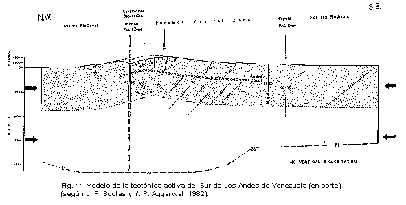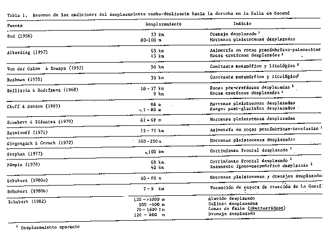 (Formación Sierra Nevada, Precámbrica) en la región de Mucuchíes, postuló un desplazamiento principalmente normal. Shagam (1972, 1975) consideró que la falla de Boconó era una extensa fosa tectónica post-paleozoica, a lo largo de la cual ocurrieron desplazamientos verticales importantes, asociados al levantamiento e inclinación de los Andes merideños durante el Terciario Tardío y el Cuaternario. Giegengack et al. (1976) hallaron indicios de ambos tipos de desplazamiento, rumbo-deslizante hacia la derecha y vertical o normal, durante el Cenozoico Tardío. Weingarten (1977) describió un paleosuelo (oxisol) a elevaciones de 1200 a 2200 m sobre el nivel del río Chama, en la cuenca de La González (al sur de Mérida), al cualinterpretó como levantado muy por encima de la elevción a la cual se formó (aunque Malagón, 1982, aporta datos sobre la génesis de suelos en los parámetros que en parte invalidan esta interpretación). Finalmente, Schubert (1980b) postuló la existencia de cuencas de tracción (pull-apart basins), tales como la cuenca de La González, a lo largo de la zona de falla de Boconó, rellenadas con sedimentos cuaternarios, las cuales se caracterízan por desplazamientos normales grandes; estas cuencas están separadas por zonas de falla angostas y con desplazamiento principalmente rumbo-deslizante hacia la derecha.