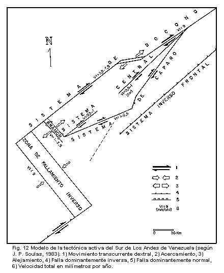 Por otra parte, la existencia del sistema Central Sur-Andino y del sistema de Caparo, se traduce por una disminución de velocidad en la parte Sur de la falla de Boconó, de tal forma que la suma de las velocidades de Boconó, Central y Caparo en el Sur de Los Andes debe ser equivalente a la velocidad de la sola falla de Boconó en su tramo mas al Norte.