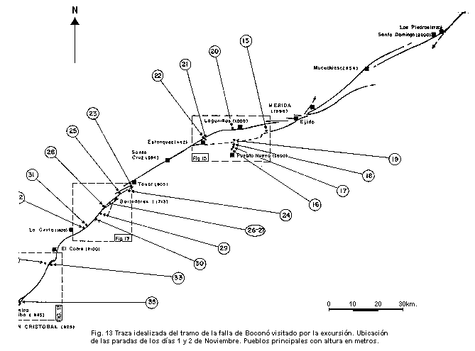 Las evidencias geomorfológicas cartografiadas en la Fig. 17, destacan la existencia de asperezas en el trazado de la falla de Boconó entre Tovar y el Portachuelo (divisoria entre los ríos La Grita y Mocotíes). Tal hecho se observa particularmente bien entre Tovar y Mesa Adrián, donde la traza de la falla se presenta bajo la forma de dispositivos discontínuos "en échelon" hacia la izquierda. Estos favorecen la concentración de esfuerzos en los sitios de interrupción de la falla, acordes con el sentido dextral del movimiento transcurrente de la falla de Boconó, evidenciado entre Tovar y El Peñón por desplazamientos característicos de los afluentes izquierdos del río Mocotíes. Tal concentración local de energía es susceptible e explicar la magnitud de los efectos geológicos ocasionados por la sismicidad histórica, cuyas huellas se conservaron hasta el presente en ciertos casos. El sismo de 1610 por ejemplo, ocasionó un alud cuyos depósitos represaron el río Mocotíes en el Volcán Aguas Arriba de Tovar y cuya cicatriz de desprendimiento es todavía fresca en el Páramo de Mariño. La extensión del lago de obturación originado de esta manera se reconoce perfectamente en el campo y con la ayuda de fotografías aéreas, aguas arriba de la Playa y en el sector del Rincón de la Laguna (A. Singer y M. Lugo 1982).