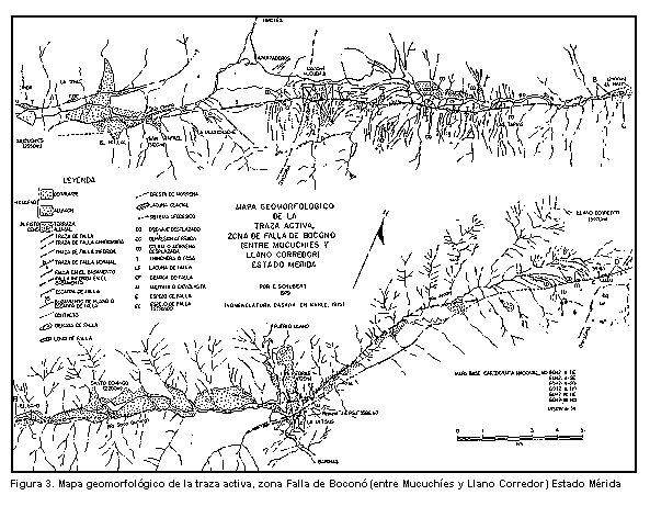 La zona de falla de Boconó, uno de los rasgos geotectónicos más importantes de la parte noroccidental de América del sur (Fig. 1), se caracteriza morfológicamente por una alineación de valles y depresiones lineales (cuancas de tracción), orientados aproximadamente en dirección N45°E. Se extiende por más de 500 km entre la depresión del Táchira (al sur de Cordero) y el Mar Caribe (área de Morón, Edo. Carabobo), cruzando en forma oblícua a los Andes merideños y cortando el extremo occidental de las Montañas del Caribe (Cordillera de la Costa y Serranía del Interior). A lo largo de toda su extensión, se observan una o varias trazas activas, denominadas falla de Boconó, la cual se caracteriza por escarpas de falla, canales fluviales desplazados, lagunas de falla, lomos de falla y otros rasgos geomorfológicos típicos de fallas rumbo-deslizantes. El desplazamiento actual y pasado a lo largo de esta zona de falla ha sido motivo de gran controversia.