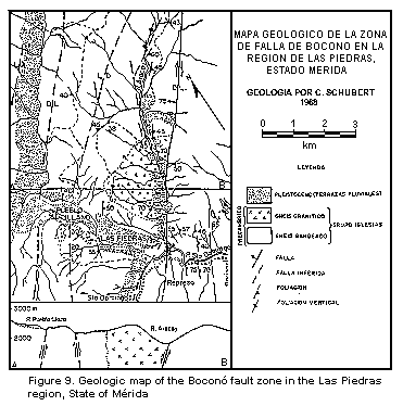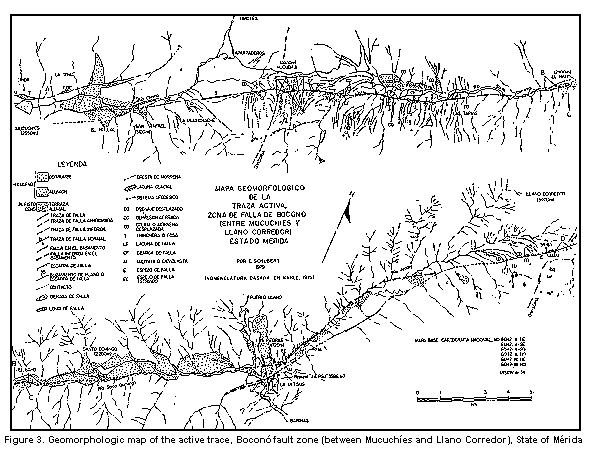 The geomorphological evidences mapped in Fig. 17, show the existente of some roughness in fault trace between Tovar and Portachuelo (divide between La Grita y Mocoties rivers). This is particularly observed between Tovar and Mesa Adrian, wherer the fault trace presents "en echelon" features towards the left. These features favour the concentration of stresses in the interruption zone of the fault in concordance with the right-lateral movement of the Boconó Fault evidenced, between Tovar and El Peñón, by characteristic displacements of the left tributaries of the Mocoties river. Such a concentration of energy could explain the size of geologic effects registered by the historical seismicity whose tracks are still present in some cases. The 1610 earthuake, for instance, caused an avalanche which dammed the valley of the Mocoties river at El Volcan, upstream Tovar. The scarp of this massive landslide is still fresh in Paramo Mariño. The extension of the lake formed is recognised clearly in the field and in aerial photographs, in the place known as Rincon de La Laguna (A. Singer, M. Lugo, 1982).