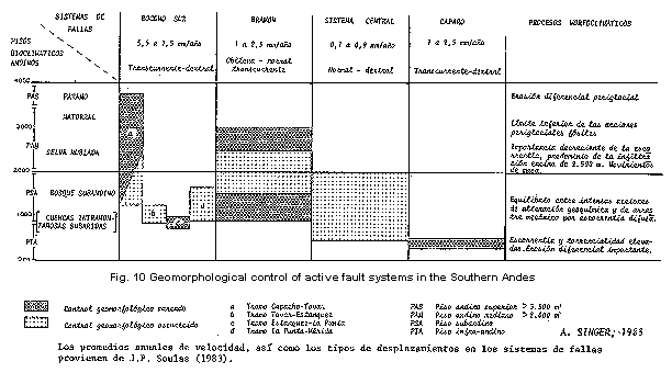 Figure 10 shows the distribution of the different segments of the Boconó Fault considered in this part of the excursion and other fault systems in the Southern Andes which are crossed by these in diverse morphogenetic environments, acording to the activity rates evaluated by geological criteria (J. P. Soulas, 1983) and according to the quality of the geomorphological control.
