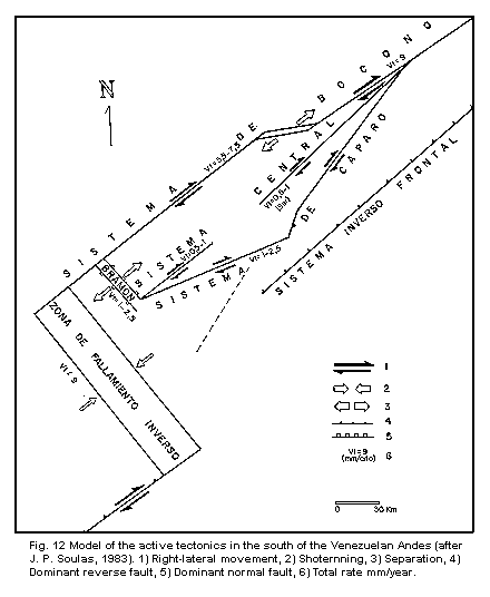 The second effect of the oblique convergence between these plates is the horizontal, right-lateral displacement of the two blocks separated by the Boconó system and the equivalent system probably located close to the Oriental Mountain range of Colombia. These main movements have as a consequence the stocking between the two places about the zone of inverse faulting (Fig. 12).