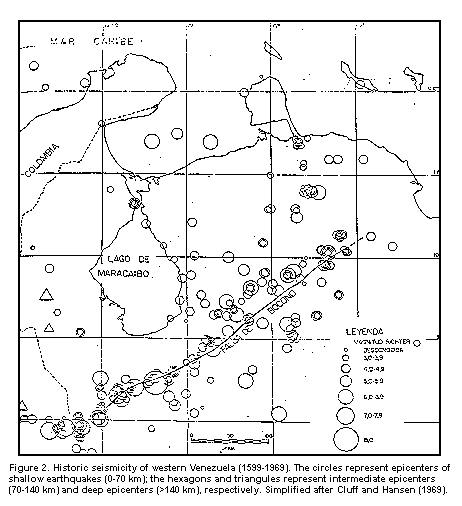 The seismic activity of the Mérida Andes has been analized by Fiedler (1970, 1972), who suggested that this activity can be subdivided into two periods: before and after the 1812 earthquake. The earthquake frequency seems to have increased after that event, but the liberated energy has not changed. Raúl Estevés, in a conference presented at the XXX Anual Convention of AsoVAC in Mérida, demonstrated that the number of earthquake with a magnitude greater than 5, between 1610 and 1945, is significantly greater near the northeastern and southwestern ends of the faukt (suggesting a greater activity at the ends, possibly because most of the offset is being taken up there), and that focal depths range from approximately 30 km near the ends of the fault to about 15 km at the center. The seismicity of the Boconó fault was studied in detail by Dewey (1972), who, on the basis of first motion analyses, showed that offset along it is consistent with an eastward displacement of the Caribbean plate with respect to South America, and also that the plate boundary is partially located along the Boconó fault (Molnar and Sykes, 1969; Schubert, 1970; Schubert and Sifontes, 1970). According to Dewey (1972), this boundary has included the Boconó fault since the Pliocene (approximately 5 million years age). The transverse orientation of the Boconó fault with respect to the cordillera, and also the fact that it crosses different geologic and tectonic provinces, is evidence that this fault is external to the Andes and that is joined the plate boundary in the Late Tertiary. Fig. 2 shows the historic seismicity of the Boconó fault, according to Cluff and Hansen (1969).