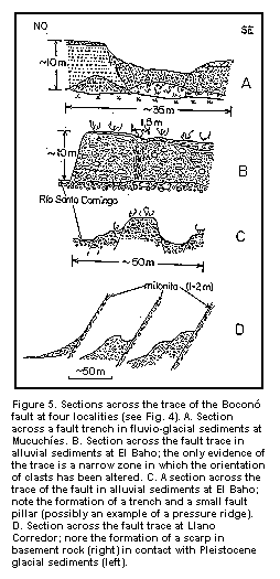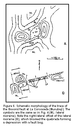 At this locality, the left lateral moraine of Quebrada El Caballo has been cut and offset 80 m in a right-lateral sense (Fig. 6). Behind the shutterridge formed by the offset moraine (to the north), a clossed depression was formed and the quebrada had to deviate by approximately 60 m to the right. To the northeast, the trace consists of a fault trech with several clossed depressions and sag ponds. Radiocarbon analyses of the top and botton sediments of these ponds suggests that the maximum age of these depressions is between 3800 and 4500 years B. P., that is, they are Holocene neotectonic features.