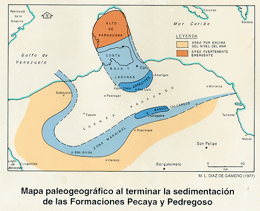 Ilustraciones: Mapa paleogeográfico de las formaciones Pecaya y Pedregoso.
