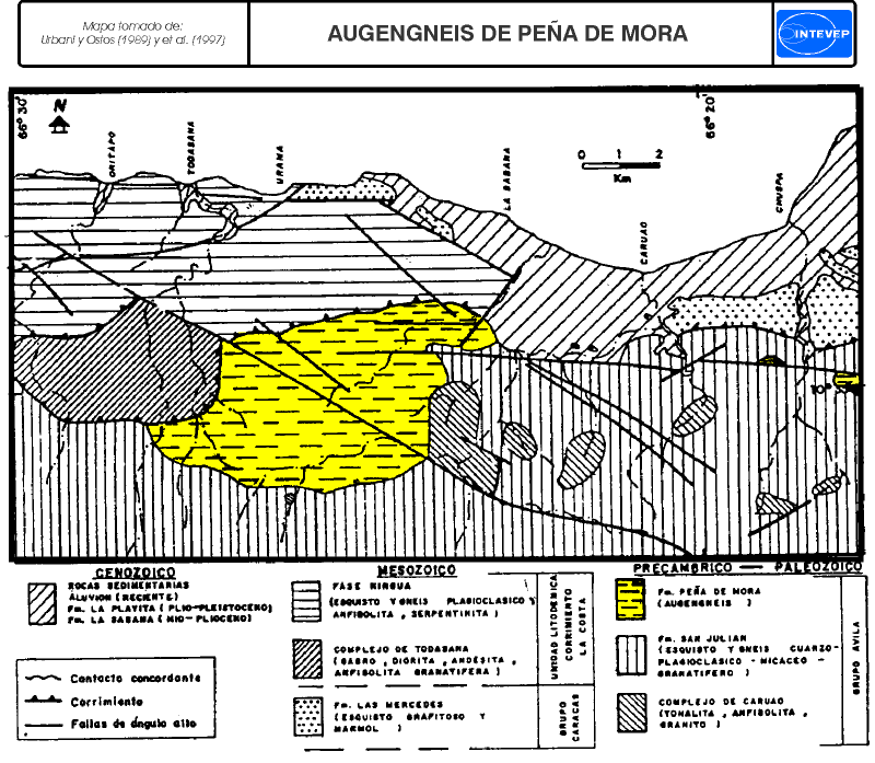 Consideraciones históricas: El nombre de "Augen - gneiss de Peña de Mora" fue introducido por Aguerrevere y Zuloaga (1937) describiéndolo como formado por inyecciones "lit - par - lit" de un magma granítico en una roca laminar. Posteriormente Dengo (1951, 1953) eleva la unidad a rango formacional. Aguerrevere (1955) presentan una cartografía geológica más detallada del área de la localidad tipo. Wehrmann (1972) y Urbani y Quesada (1972) amplían su significado para incluir esquistos, cuarcita, mármol y anfibolita. Urbani y Ostos (1989) basándose en un soporte de cartografía geológica más detallada de extensos tramos de la Cordillera de la Costa, a escala 1:10.000 y 1:25.000, restringen este nombre sólo a los cuerpos de augengneis y gneises graníticos y aquellas zonas que si bien tienen otros tipos de rocas intercaladas con los augengneises, éstos sean los predominantes.