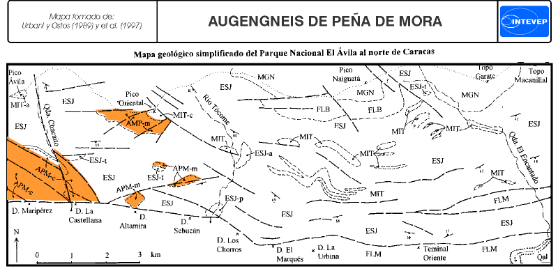 Ilustraciones: Mapa geológico del Macizo de El Avila, D.F., Augengneis de Peña de Mora y Mapa geológico simplicado del Parque Nacional El Avila al norte de Caracas.