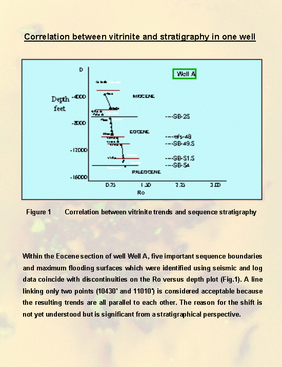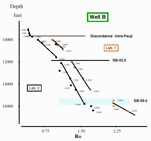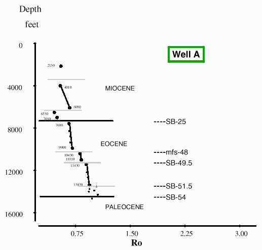 Within the Eocene section of Well A, five important sequence boundaries and maximum flooding surfaces which were identified using seismic and log data, coincide with discontinuities on the Ro versus depth plot (Fig.1). A line linking only two points (10430' and 11010') is considered acceptable because the resulting trends are all parallel to each other. The reason for the shift is not yet understood but is significant from a stratigraphical perspective.