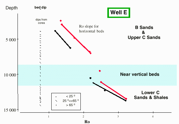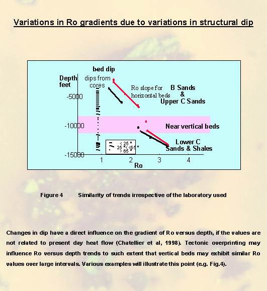 Changes in dip have a direct influence on the gradient of Ro if the values are not related to present day heat flow (Chatellier et al, 1998). Tectonic overprinting may influence Ro versus depth trends to such extent that vertical beds may exhibit similar Ro values over large intervals. Various examples will illustrate this point (one of them is shown in Fig.4).