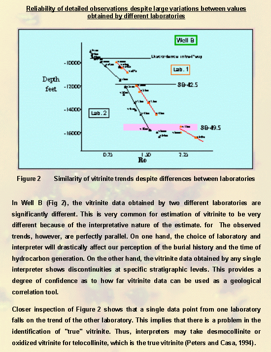 In Well B (Fig 2), vitrinite data obtained by two different laboratories are significantly different, which is very common for estimation of vitrinite because of the interpretative nature of the estimation. The observed trends, however, are perfectly parallel. On one hand, the choice of laboratory and interpreter will drastically affect our perception of the burial history and the time of hydrocarbon generation. On the other hand, the vitrinite data obtained by any single interpreter shows discontinuities at specific stratigraphic levels. This provides a degree of confidence as to how far vitrinite data can be used as a geological, correlation tool.