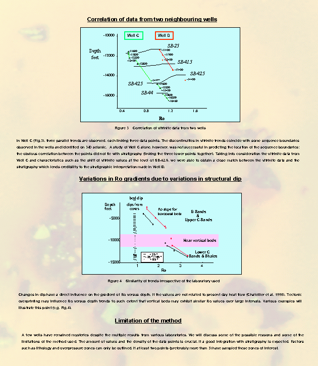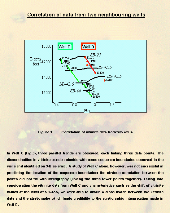 In Well C (Fig.3), three parallel trends are observed, each one linking three data points. The discontinuities in vitrinite trends coincide with some sequence boundaries observed in the wells and can be identified on 3-D seismic.