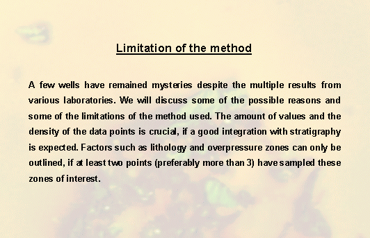 A few wells have remained mysteries despite the multiple results from various laboratories. We will discuss some of the possible reasons and some of the limitations of the method used. The amount of values and the density of the data points is crucial if a good integration with stratigraphy is expected. Factors such as lithology and overpressure zones can only be outlined if at least two points (preferably more than 3) have sampled these zones of interest.
