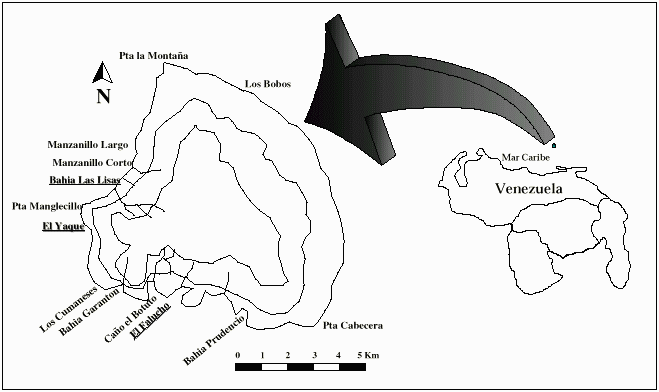 Figura 1: Ubicación de la Isla de La Blanquilla y puntos de muestreo.