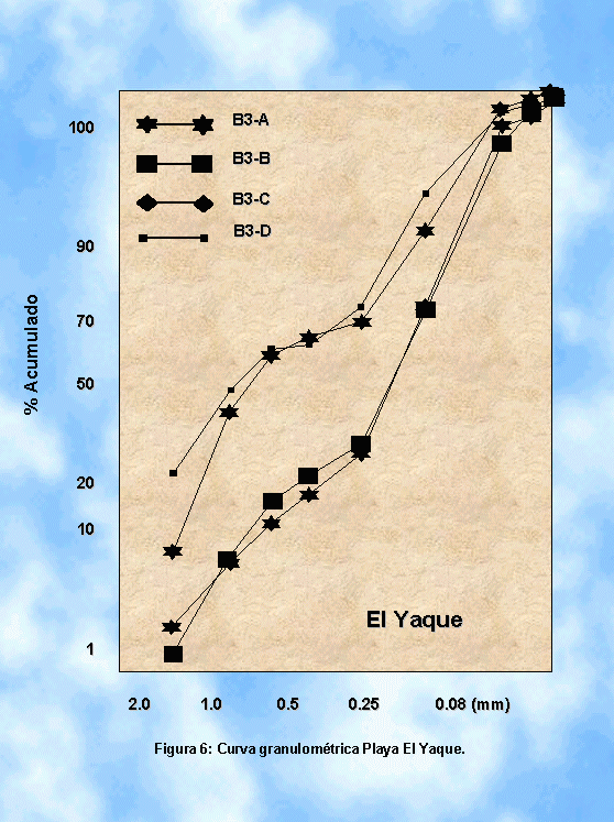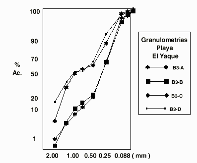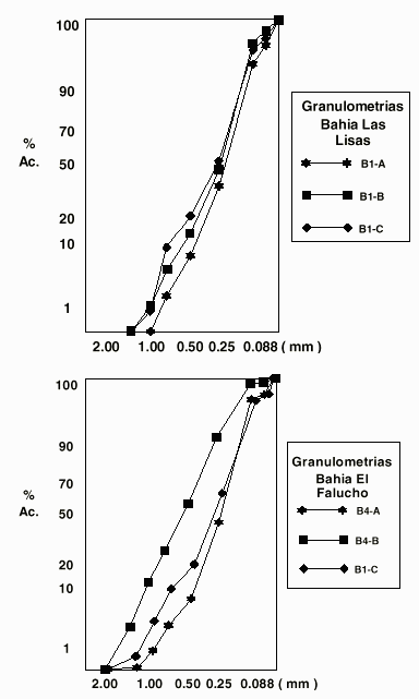 Con respecto a los análisis granulométricos, en las arenas predominan las fracciones medias (0.274 a 0.386 mm; Tabla 1 y Figura 2), pero con presencia en las muestras de El Yaque, de arenas muy gruesas (1.15 y 1.20 mm) y además hay presencia de arenas finas (0.23 a 0.241 mm), tanto en bahía de El Falucho, como en Caño La Lisa.
