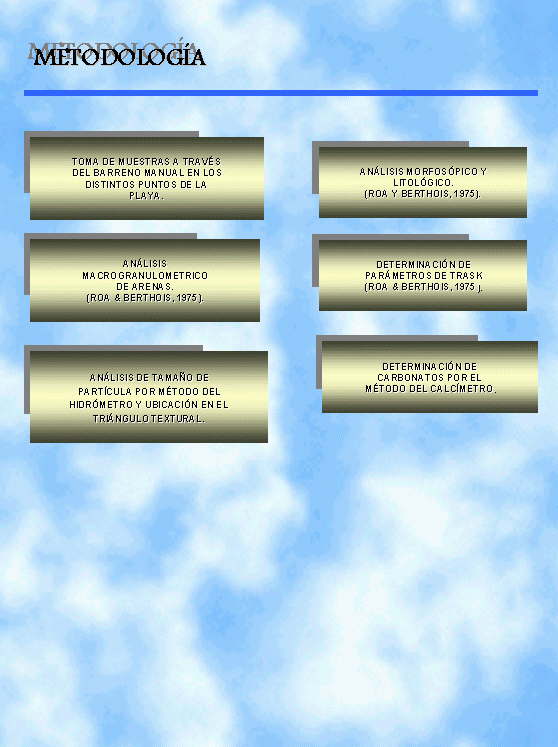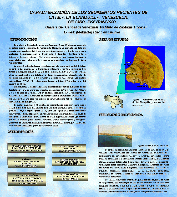 El presente trabajo, por tanto centra su principal objetivo en la caracterización de estas zonas de acumulación reciente, donde la primera salida de campo hacia La Blanquilla se realizo en el T-62 de la A.R.V. y además presentar los objetivos principales que se desea obtener en una futura expedición a dicha isla, como es la caracterización sedimentológica de las demás playas Holocenicas de esta isla, con especial interés en sus características granulométricas, químicas y mineralógicas.