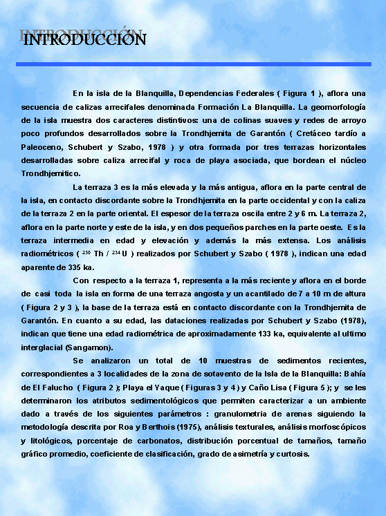 Con respecto a la terraza 1, representa a la más reciente y aflora en el borde de casi toda la isla en forma de una terraza angosta y un acantilado de 7 a 10 m de altura. La base de la terraza está en contacto discordante con la Trondhjemita de Garantón. En cuanto a su edad, las dataciones realizadas por Schubert y Szabo (1978), indican que tiene una edad radiométrica de aproximadamente 133 ka, equivalente al ultimo interglacial (Sangamon). En cuanto a los sedimentos recientes de la isla, pocos han sido los trabajos realizados (Caraballo 1972; Méndez, 1985) para la descripción sedimentológica de estas áreas; a pesar del repunte que tiene los estudios sedimentológicos en áreas marino-costeras (Delgado & Roa, 1997), la mayoría de los estudios geológicos realizados en la isla La Blanquilla, por diversos autores (Maloney, 1971; Schubert, 1976; Schubert y Szabo, 1978 y Méndez, 1985) han sido entre otros, haciendo especial énfasis en el estudio de las terrazas marinas y su correlación con diferentes eventos climáticos durante el periodo Cuaternario.