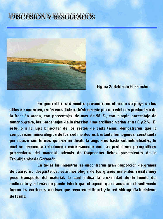 En todas las muestras se encontraron gran proporción de granos de cuarzo no desgastados, esta morfología de los granos minerales señala muy poco transporte del material, lo cual indica la proximidad de la fuente del sedimento y además se puede inferir que el agente que transporto el sedimento fueron las corrientes marinas que recorren el litoral y la red hidrografía incipiente de la isla, además las muestras presentan un gran contenido de material calcáreo con sedimentos compuestos de detritus de moluscos, algas calcáreas y corales, que la hacen bastante heterogénea en su fracción no cuarzosa.