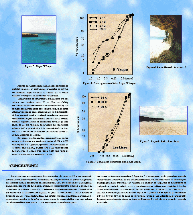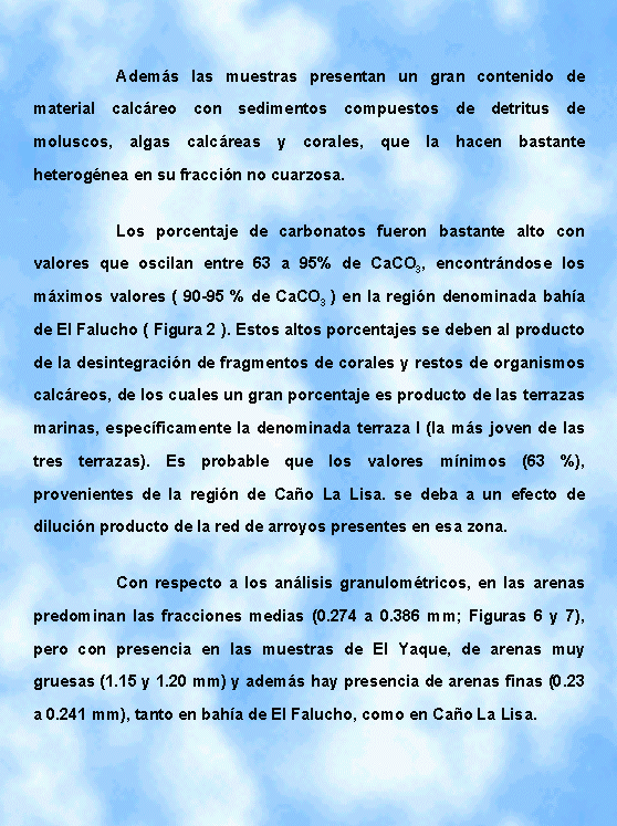 Los porcentajes de carbonatos fueron bastante alto con valores que oscilan entre 63 a 95% de CaCO3, encontrándose los máximos valores (90-95 % de CaCO3, Tabla 1) en la región denominada bahía de El Falucho. Estos altos porcentajes se deben al producto de la desintegración de fragmentos de corales y restos de organismos calcáreos, de los cuales un gran porcentaje es producto de las terrazas marinas, específicamente la denominada terraza I (la mas joven de las tres terrazas). Es probable que los valores mínimos (63 %), provenientes de la región de Caño La Lisa, se deban a un efecto de dilución producto de la red de arroyos presentes en esa zona.
