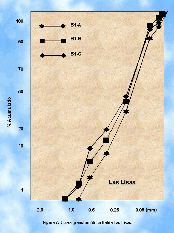 En general los sedimentos presentes en el frente de playa de los sitios de muestreo, están constituidos básicamente por material con predominio de la fracción arena, (Tabla 1), con porcentajes de mas de 98 %, con ningún porcentaje de tamaño grava, los porcentajes de la fracción limo-arcillosa, varían entre 0 y 2 %. El estudio a la lupa binocular de los restos de cada tamiz, demostró que la composición mineralógica de los sedimentos es bastante homogénea, constituida por cuarzo con formas que varían desde las angulares hasta sub-redondeadas, lo cual se encuentra relacionado estrechamente con las posiciones petrográficas proveedoras del material, además de fragmentos líticos provenientes de la Trondhjemita de Garantón.