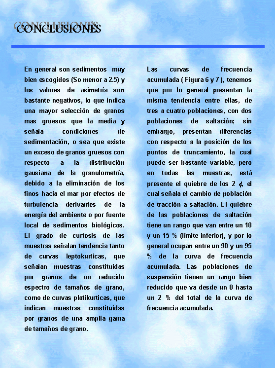 Tabla 1: Análisis Texturales, porcentajes de Carbonatos y Parámetros sedimentológicos (Trask): MD (tamaño medio de grano); SO: Grado de Escogimiento; SK: Grado de Asimetría; K: Curtosis.