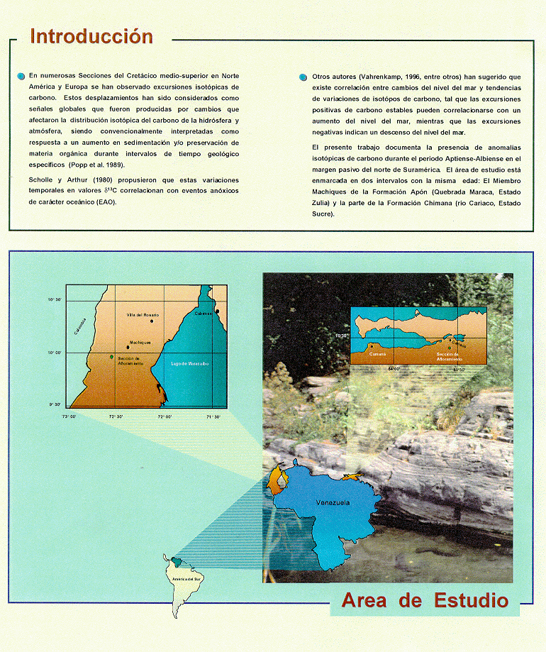 El presente trabajo documenta la presencia de estas anomalías durante el período Albiense-Aptiense en el margen pasivo del Norte de Suramérica. Para ello se tomaron muestras en la cuenca Oriental y cuenca Occidental de Venezuela en dos intervalos con este rango de edad: el Miembro Machiques de la Formación Apón (Quebrada Maraca, estado Zulia) y la parte de la Formación Chimana (río Cariaco, estado Sucre, ver Figura 1). Ambos intervalos comprenden alternancias de margas y calizas con contenidos de materia orgánica que varían entre 1 y 6 %. Las unidades estudiadas fueron depositadas durante el ahogamiento parcial de la plataforma carbonática de Venezuela en el Aptiense medio-Albiense temprano (Martínez y Hernández, 1992).