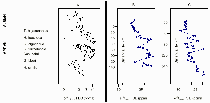 En la figura 2, se presenta una comparación de la variación isotópica de la materia orgánica del intervalo Aptiense-Albiense, en la sección de quebrada Maraca y en la sección de río Cariaco, así como los perfiles isotópicos de carbono en carbonatos del Atlántico y en el dominio del Tethys, en Europa reportados por Weissert y Lini (1991).