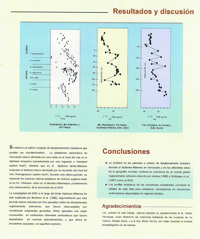 La similitud en los patrones y valores de desplazamiento isotópico durante el Aptiense-Albiense en la plataforma carbonática de Venezuela en los diferentes sitios de la geografía mundial, confirma la ocurrencia de un evento global regionalmente extensivo, que ha sido descrito por Jenkyns (1980) y Schlanger et al. (1987) como un evento anóxico oceánico.