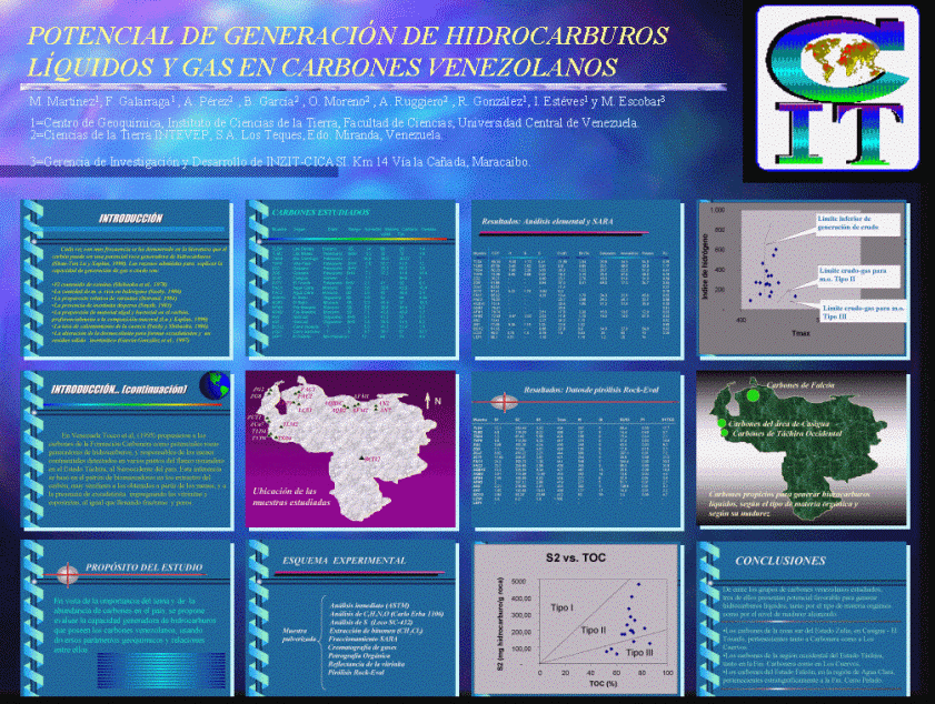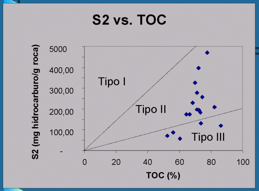 Aún cuando este análisis es meramente exploratorio, se aprecia que contrariamente a lo que comunmente se tiene establecido, buena parte de los carbones estudiados se comporta como si su materia orgánica constituyente fuese de Tipo II. Esta "anomalía" es debida al uso de parámetros derivados de la experiencia Rock-Eval aplicada a carbones, por el altísimo contenido de bitumen extraible, en comparación con lutitas o lodolitas carbonáticas. No obstante, el contenido en macerales exiníticos en carbones venezolanos suele ser desusadamente alto, como ya ha sido reportado previamente (Kapo, 1972; Escobar y Martínez, 1993).