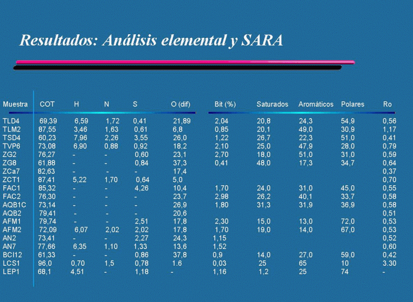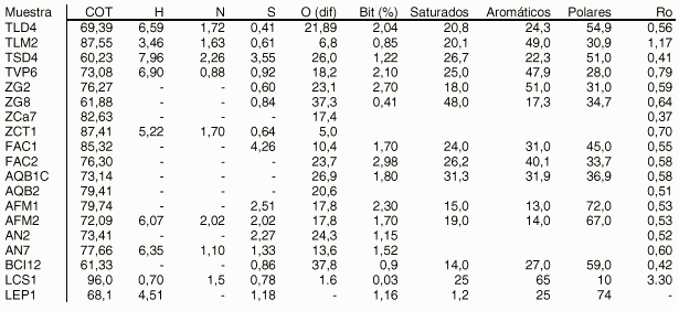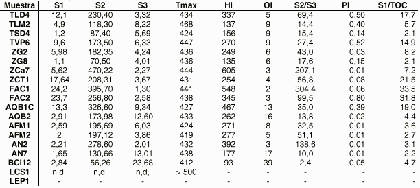 En la tabla 2 se muestran los datos obtenidos de los análisis realizados a los carbones. La concentración de carbono orgánico total COT) varía entre 52.42 y 86.2 % en peso, con un valor promedio de 70.0 %. Estas muestras presentan concentraciones de materia orgánica extraíble que oscilan entre 4060 y 29800 ppm, con un valor promedio de 16930 ppm. Estos resultados indican en una primera aproximación que los carbones presentan buenos tenores de COT y de bitumen, por lo que pueden ser considerados adecuados para generar hidrocarburos. La tabla 3 presenta los resultados de la pirólisis Rock-Eval, así como algunos parámetros geoquímicos derivados de los mismos.