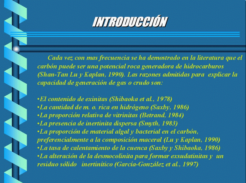 El carbón es considerado generalmente como una fuente de gas natural; sin embargo, cada vez con mas frecuencia se ha demostrado en la literatura que puede ser una potencial roca generadora de hidrocarburos (Shan-Tan Lu y Kaplan, 1990). Las razones admitidas para explicar la capacidad de generación de gas o crudo son : el contenido de exinitas (Shibaoka et al., 1978), la proporción de materia orgánica rica en hidrógeno (Saxby et al., 1986), la proporción relativa de vitrinitas (Bertrand, 1984), la presencia de inertinita dispersa (Smyth, 1983), o la proporción de material de origen algal y bacterial en el carbón, preferiblemente a la composición maceral (Shan-Tan Lu y Kaplan, 1990). Tambien se asumen razonamientos geológicos, como la tasa de calentamiento de la cuenca (Saxby y Shibaoka, 1986) o factores geológicos particulares de la cuenca (Durand y Paratte, 1982).