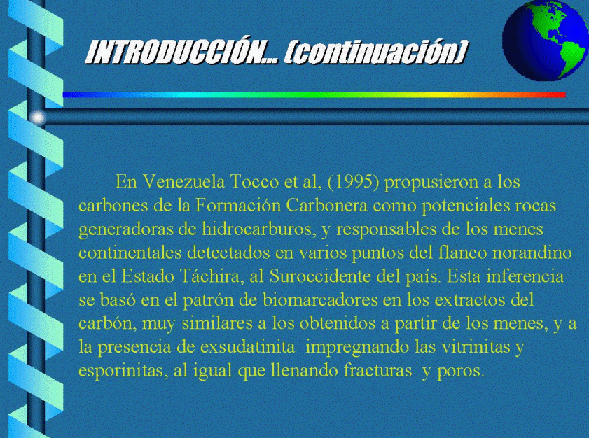 En Venezuela, Tocco et al. (1995) propusieron a los carbones de la Fm. Carbonera como potenciales rocas generadoras de hidrocarburos, y responsables de los menes continentales detectados en varios puntos del flanco norandino en el Estado Táchira, al suroccidente del país. Esta inferencia se basó en el patrón de biomarcadores en los extractos del carbón, muy similares a los de los menes, y a la presencia de exsudatinita impregnando las vitrinitas y esporinitas, el igual que llenando microfracturas y poros. El potencial de generación de crudos y gas por parte de una roca o de un carbón puede ser evaluado satisfactoriamente en el laboratorio mediante experimentos de pirólisis, ya sea anhidra (Shan-Tan Lu y Kaplan, 1990; Horsfield et al., 1988) o hidropirólisis (García-González et al., 1997).