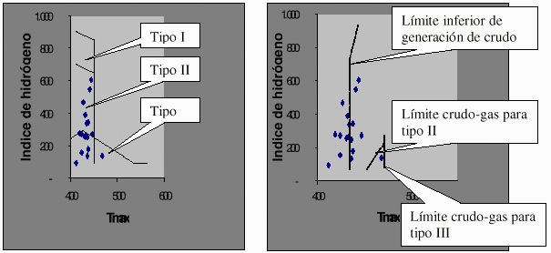 Figura 1: Gráfico de Tmax vs. HI para los carbones estudiados. (a) Definición de tipo de materia orgánica. (b) Definición de límites inferior y superior de generación de crudo (modificado de Espitalié et al. ,1984)