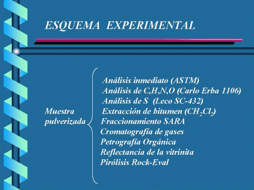 Los carbones fueron pulverizados hasta 60 mallas para efectuar los análisis inmediatos conforme a las normas establecidas (ASTM). Los análisis elementales se llevaron a cabo en un equipo CARLO ERBA 1106; el contenido de azufre total se efectuó en un analizador LECO SC-432. La extracción del bitumen se llevó a cabo en extractores Soxhlet, con CH2Cl2 como solvente, durante 72 h. La separación del bitumen en saturados, aromáticos y polares se efectuó por cromatografía de columna con alúmina activada como soporte, y usando como eluentes n-hexano, tolueno y tolueno:metano 70:30 respectivamente. Los análisis petrográficos, de reflectancia de la vitrinita y la pirólisis Rock-Eval fueron efectuados en los laboratorios de la Exxon Production Research, Co, y en INTEVEP.